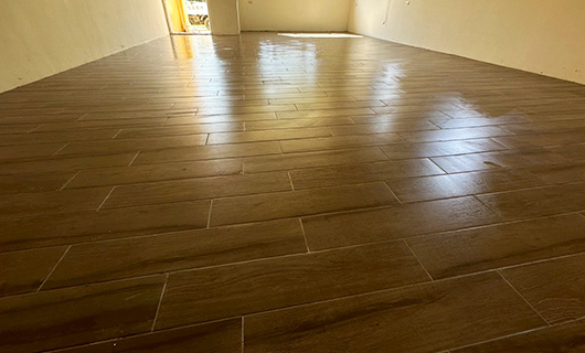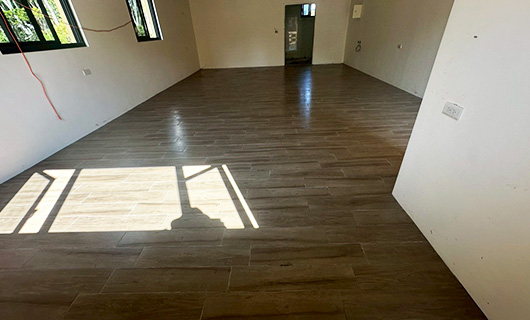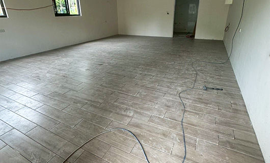 使用適合的大顆粒黏著劑,確保抓地力夠強。 貼的時候會用磚縫調整器(俗稱青蛙或十字架)固定,避免高低差。 每一片都會注意「木紋方向」「色差分布」,讓整體看起來不會假假的一片色。